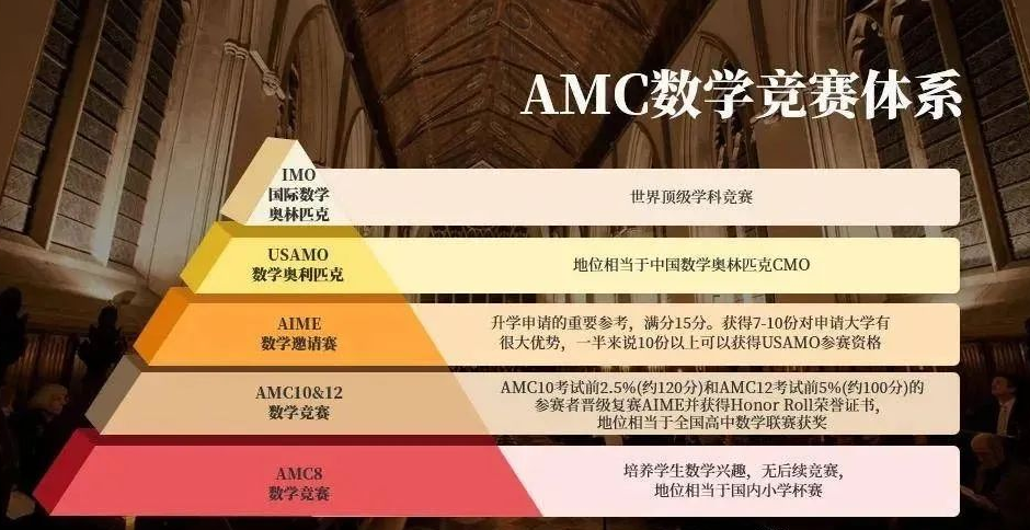 美国数学测评,简称AMC,由美国数学协会(MAA)举办,在1950 年,美国数学协会(简称MAA)开始举办美国高中数学考试(AHSME)。在1985年时,MAA又增加了初中数学的考试(AJHSME)。2000年以后,这些考试统一被称为 AMC。AMC等级划分为AMC8、AMC10、AMC12、AIME、USA(J)MO、IMO,中国学生能参加的最高级别是AIME阶段。是目前世界上信度和效度最高的数学科测试。作为绝大多数专业都可以申请参加的数学活动,每年都有超过30多万名学生参加。