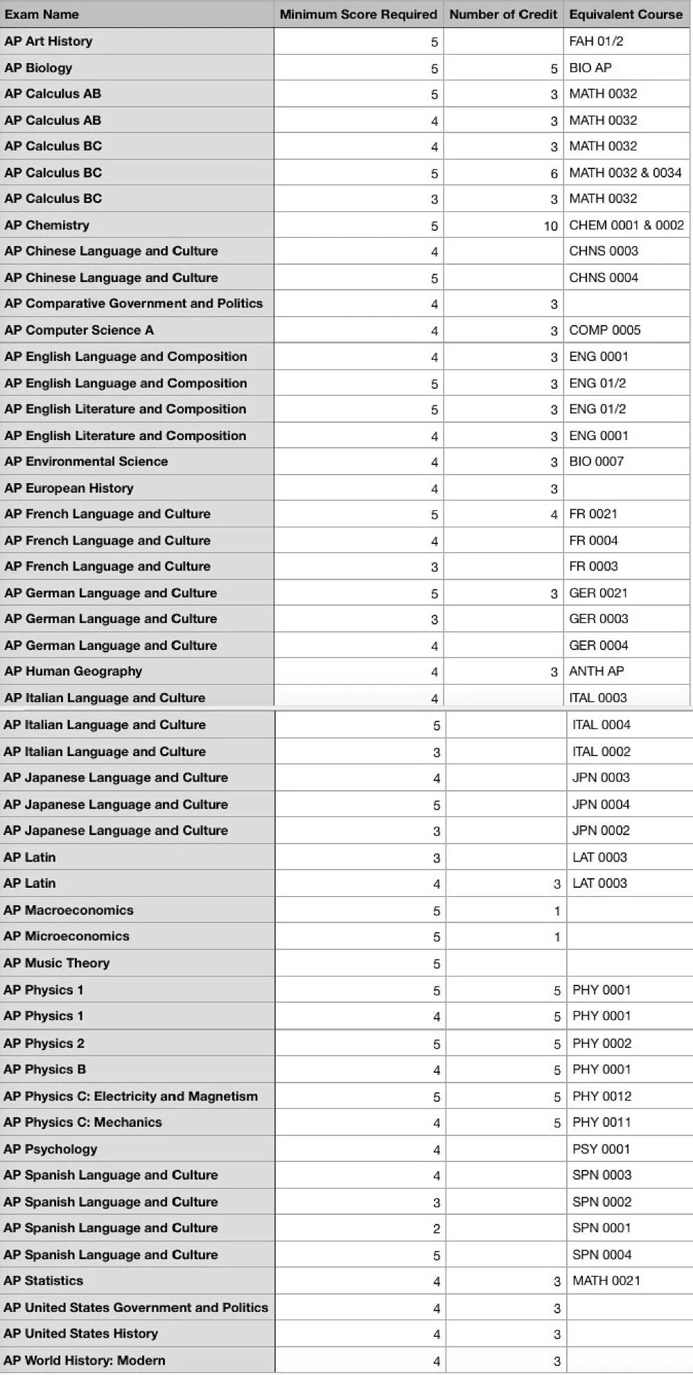 AP成绩在杜克大学还可以免修课程,并且这门课程会显示在学生的成绩单上。从杜克大学毕业需要34个学分,如果学生选择提前毕业,提前毕业一年可以多换取6个额外学分,提前毕业半年则可多计入2个学分。