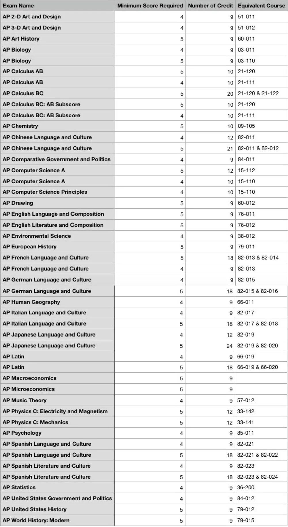 宾大的AP换分政策限制比较多,首先是需要学生必须拿到满分(5分)才能进行学分换取或免修课程。