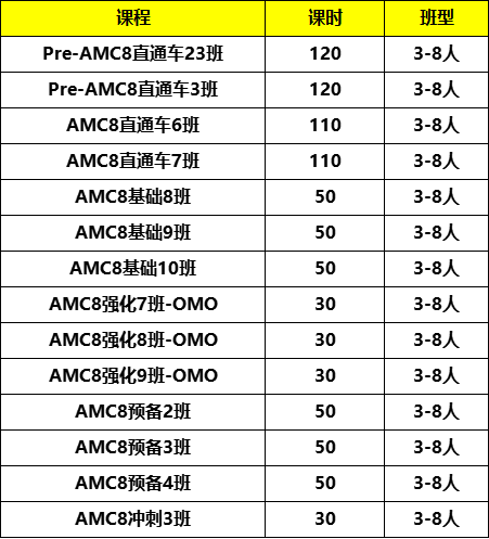 我们根据不同水平的AMC8竞赛考生学习,分为Pre-AMC班、AMC8基础班、AMC8强化班、AMC8冲刺班、AMC8全程班等!让每一个学员都得到针对性的辅导和提升~