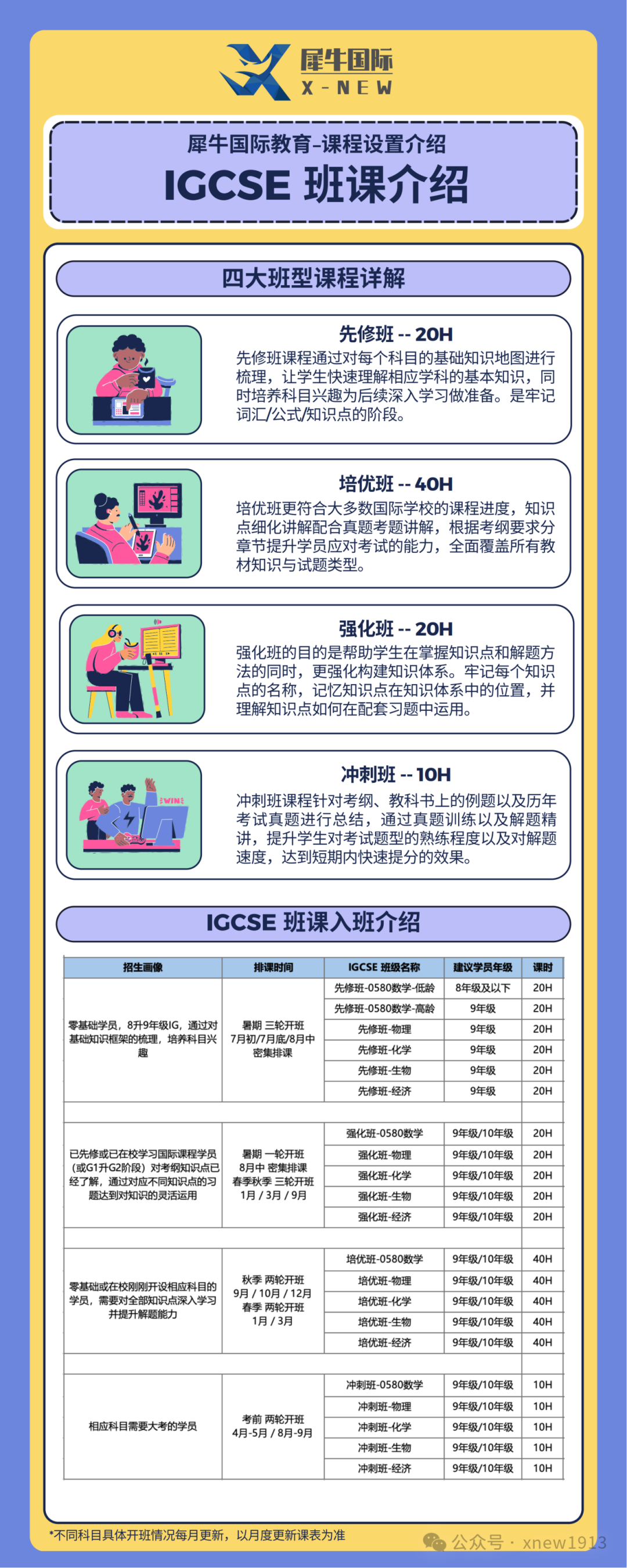 犀牛IGCSE辅导课程基本上覆盖所有热门科目,有IGCSE预习先修班、IGCSE同步培优班、IGCSE考前冲刺班、IGCSE脱产学习班等,适合不同不同需求和基础的孩子备考