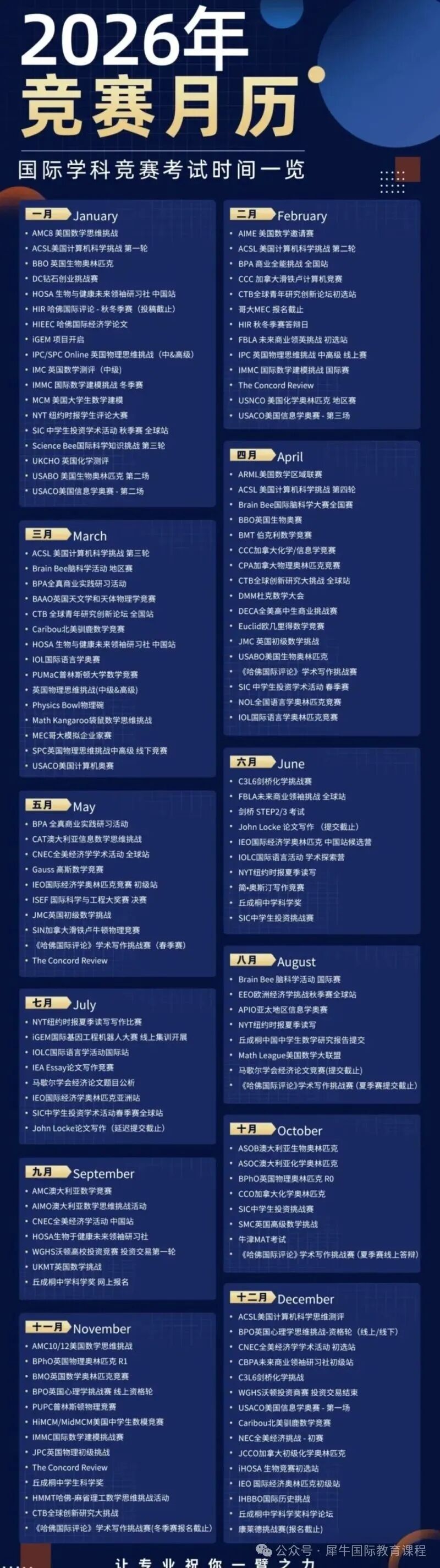 2026年高含金量国际数学竞赛,全年龄段覆盖 许多家长会让孩子参加一些国际数学竞赛,但到底什么样的竞赛含金量高却不清楚,今天我就为大家盘点一下26年的高含金量国际数学竞赛。AMC、AIME、欧几里得、BBO&USABO、USACO、物理碗等竞赛小班课报名中!犀牛国际竞赛培训课程辅导介绍~犀牛国际教育USABO竞赛机构推荐,上海北京深圳合肥南京犀牛教育USABO生物竞赛辅导报名中~上海犀牛教育官方电话可以咨询网站客服