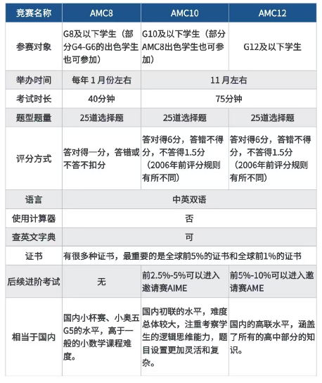 AMC8:适合8年级(初二)及以下学生,考试当天不超过14.5周岁。考试时间通常在每年1月。