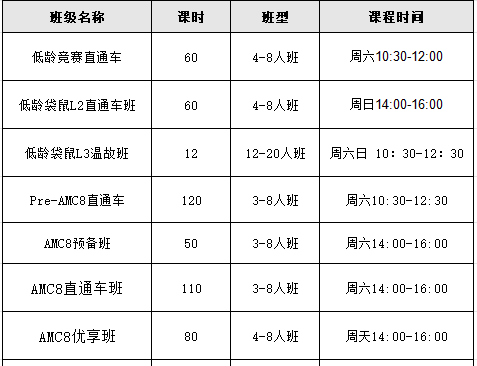 特别开设不同阶段的培训课程,比如:AMC8预备班,PreAMC8全程班,AMC8全程班,AMC8基础班,AMC8强化班,AMC8冲刺班,AMC8优享班等多个类型的AMC8培训课程,都是根据同学们的基础情况来匹配的。