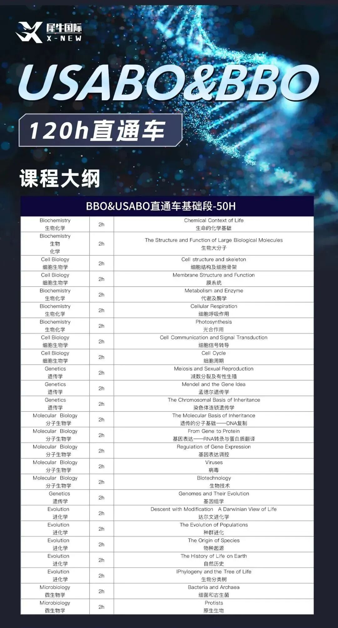 犀牛教育生物竞赛直通车课程既强化USABO所需的分子细节、实验逻辑,又覆盖BBO的生态广度,一套课程帮助同学们直击USABO&BBO核心考点。