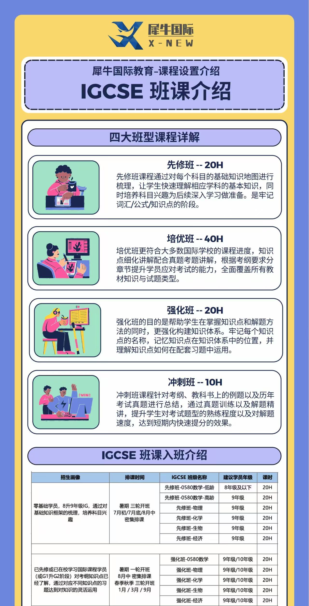 开设IGCSE全科目培训班:IGCSE数学0580、IGCSE数学0606、IGCSE物理、IGCSE化学、IGCSE生物、IGCSE经济等课程。